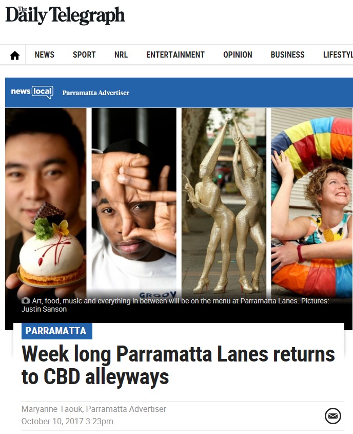 THE DAILY TELEGRAPH “Week long Parramatta Lanes returns to CBD alleyways” Maryanne Taouk, Parramatta Advertiser, October 10, 2017 Share this:Share Click to share on Facebook (Opens in new window) Facebook Click to share on X (Opens in new window) X Like Loading... Related