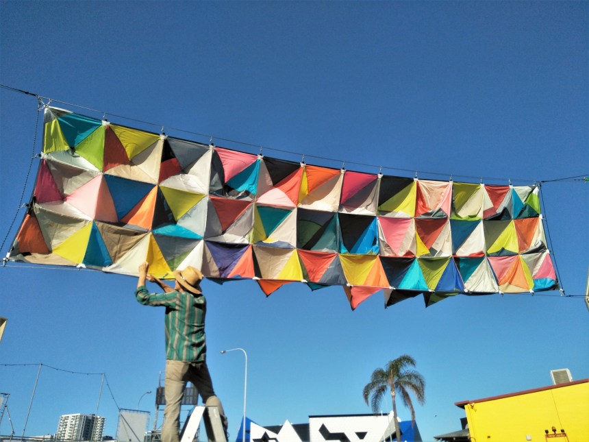 “Gelato Skies” was the combination of two sail installations that blanketed Perth skies with a kaleidoscope of colour. Made entirely from discarded tent material (collected from music festivals), Georgina’s thorny patchworks floated like a sea of stalactites, sharp in appearance but soft to the touch for the duration of 2018-19 Ice Cream Festival season. Born out of a collaboration between event activators Bar Pop and several top brick-and-mortar-players including Mechanics’ Institute, The Dominion League, The Court and El Grotto, the Ice Cream Factory played host to Perth’s first ‘summer micro-festival’, transforming Northbridge for four weeks in Dec 2018 through Jan 2019. Set on the green corner at Roe and Lake Street, the venue sprawled from a central outdoor space into the adjoining warehouse, and wound its way upstairs to reveal several custom-built rooftop bars and decks.